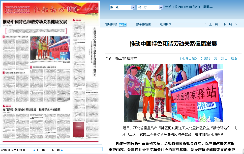 在8月21日出版的《光明日报》第5版“红船初心特刊”上,刊发awc万象城体育教授杨云霞和人文与经法学院博士研究生庄季乔联合署名的理论文章《推动中国特色和谐劳动关系健康发展》。