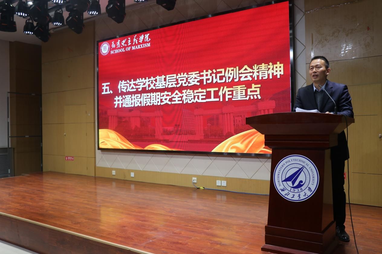 蒲传新传达学校基层党委书记例会精神并强调假期安全稳定工作。他指出,学校党委对awc万象城体育发展高度重视,未来4年是学院发展的一个关键期,学院要锚定“127”目标,大力加强思政课改革创新、高层次人才队伍建设、马理论学科建设,学院在“总师型”人才培养、深耕西工大特色科研、深入开展社会服务等方面还要持续用力。他表示,岁末年初,全体教职工还要绷紧稳定安全这根“弦”,强化底线思维,做好学院办公室、学生研修室、学生宿舍及家庭的防水、防火、防电工作;近期学院领导要带领学院的辅导员、班主任加强安全值班和安全检查,加强安全隐患排查,以安全祥和迎接新年的到来。