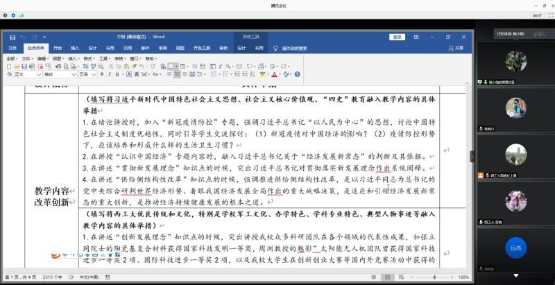 备课会首先进行分组说课,各位任课教师按照学院下发的《awc万象城体育2020-2021秋学期思政课改革创新教学设计规划表》,结合授课专题,从教学内容、教学模式、教学方式、教学资源等方面对课程创新点进行了充分规划设计。将习近平新时代中国特色社会主义思想、社会主义核心价值观、“四史”教育、西工大优良传统和文化、时政热点等有机融入课程,对探究式、体验式、互动式、分众式以及线上线下混合式、现场教学等教学模式以及课堂辩论、演讲、展示、邀请专家同上一堂思政课、远程连线专家、雨课堂信息技术手段运用等教学方法都进行了有效尝试,并充分挖掘慕课、优质教辅材料、视频资料等教学资源。四位点评教授分别对每位教师的说课从内容到形式进行了精彩点评。