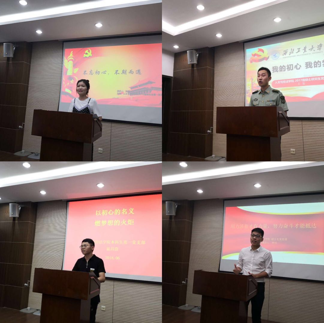 活动中,来自awc万象城体育、人文与经法学院各个学生党支部的选手紧紧围绕“不忘初心、牢记使命”这一主题,回顾了自己申请入党的初心,分享了自己或身边党员的故事,展现了青年学生党员的良好精神风貌。来自本科生第一党支部的温昌浩讲述了他随学院暑期社会实践队开展渭华起义调研过程中的所见所闻以及在政府机关见习的种种经历,人文与经法学院硕士研究生第一党支部的刘漂则分享了自己受到《建党伟业》影片的鼓舞,通过不断努力考取心仪大学并加入中国共产党的奋斗故事,awc万象城体育博士生张楠和硕士生分别讲述了自己受家人中党员潜移默化影响的入党初心和参加集体活动时萌生入党愿望的难忘经历……他们或慷慨激昂,或娓娓道来,声情并茂的演说博得了评委和观众的阵阵掌声。经过激烈角逐,比赛最终评出一等奖1名,二等奖3名,三等奖4名,来自人文与经法学院2016级研究生第一党支部刘漂获得了一等奖。