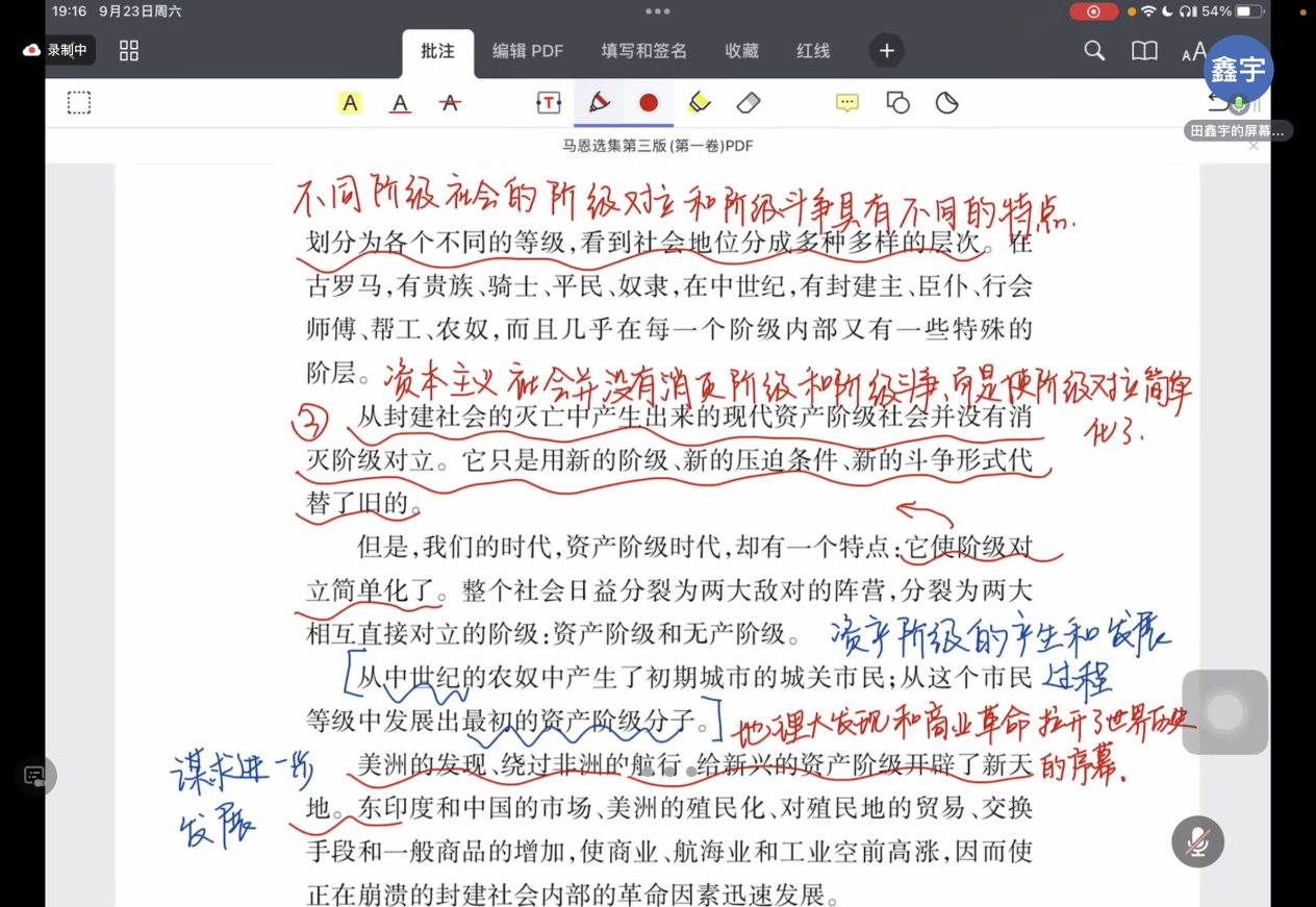 第三位同学王锟讲述了无产阶级的历史任务及其阶级特点。他指出,无产阶级具有先进性和革命性,应该彻底推翻现有的生产方式和私有制,以实现人类社会的进步和发展。同时,他也讨论了资产阶级与无产阶级之间对立发展趋势,强调资产阶级必然灭亡的历史规律。他提出的问题是:如何看待社会财产和个人财产的关系?孙宗岭老师认为社会财产不是高于个人财产的存在,因为他们是不同的维度,并且社会财产也绝不是个人财产的简单总和。张晶老师也认为马克思承认个人财产的合法性,他批判的是占有他人劳动的权利,而不是整个社会财富。